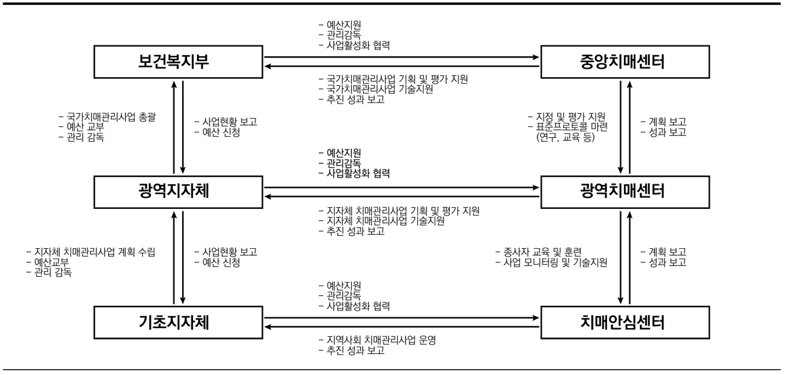 치매정책 추진체계로는 보건복지부 산하에 중앙치매센터 등이 있으며 체계적으로 연계되어있는 것을 볼 수 있다.